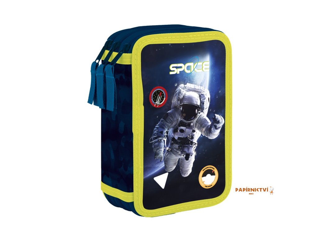 Školní penál třípatrový bez náplně. Penál obsahuje 40 gumových poutek pro uložení všech psacích potřeb a drobností potřebných k výuce. Penál má pevný zip s velkými taháčky pro snadnou manipulaci. Jedno patro je opatřeno průhlednou přihrádkou pro týdenní rozvrh.
