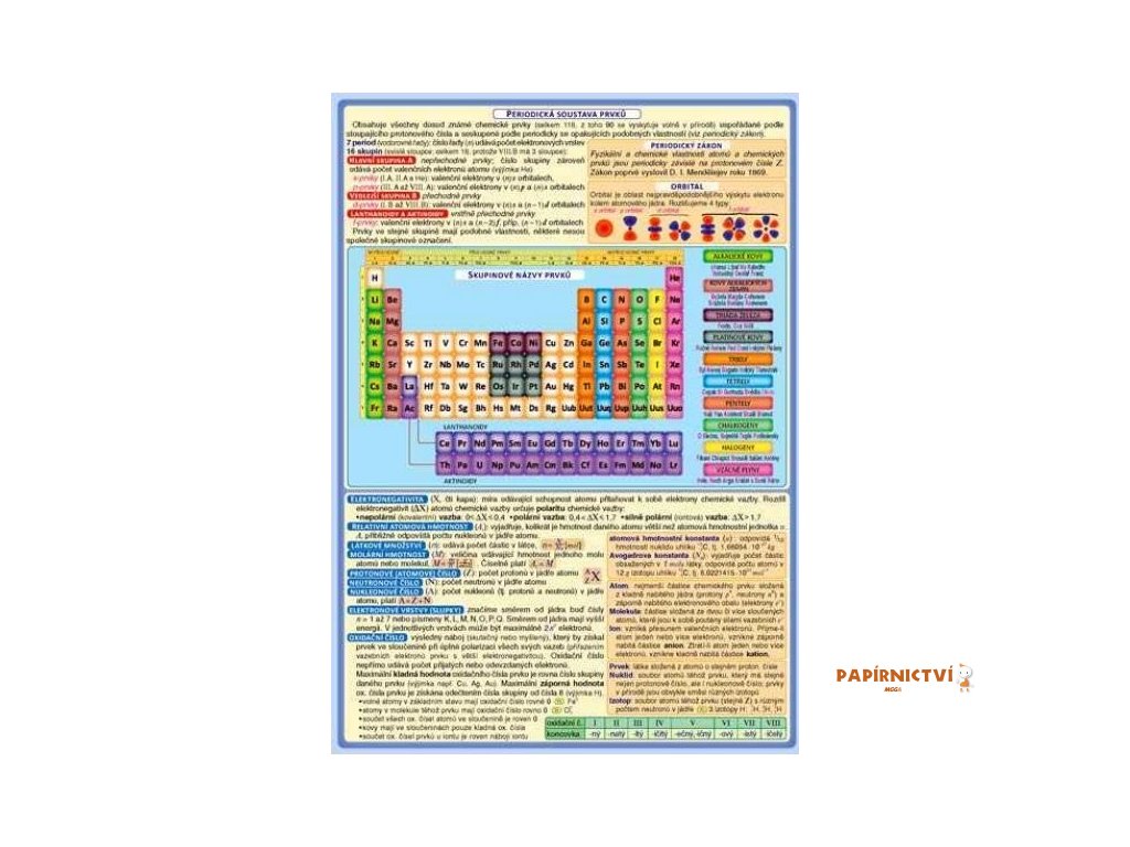 Vhodný doplněk k přehledu chemie. Obsahuje rovněž zjednodušenou variantu tabulky a přehled vlastností významných prvků.