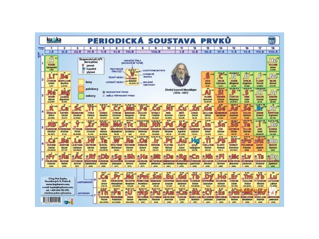 - oproti verzi ve formátu A4 jde o jednostrannou tabulku, ve které pro přehlednost není uvedena obsazenost elektronových vrstev