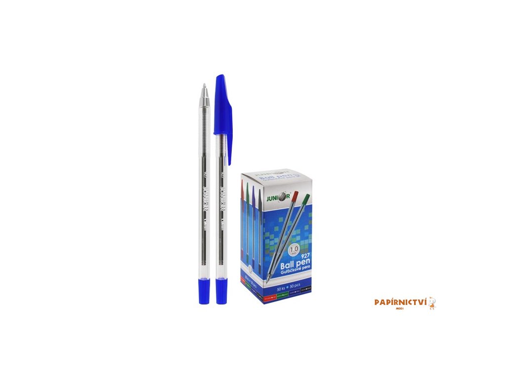 Jednorazové pero s průhledným čírým tělem, se zakončením a uzávěrem v barvě náplně, -barva modrá.