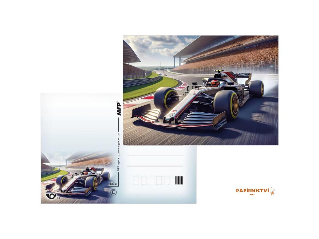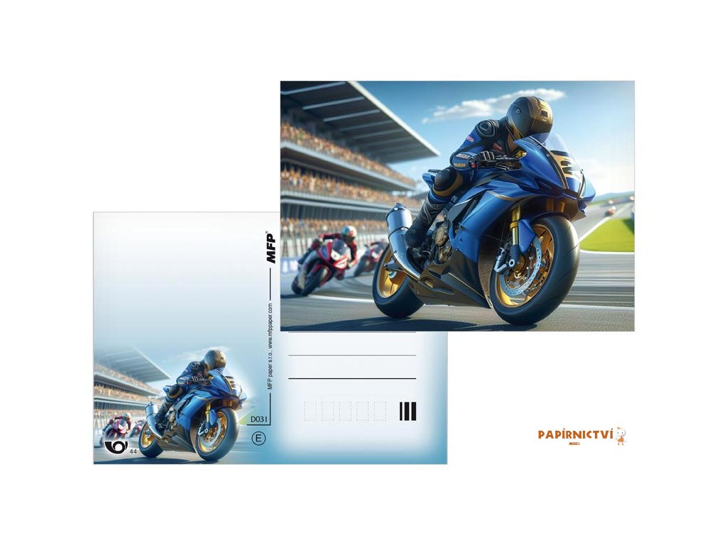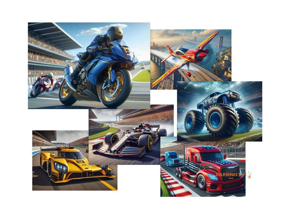 Pohlednice s motivy různých závodních prostředí (motorky, letadlo, formule…). Pohlednice jsou bez textu na zadní straně.