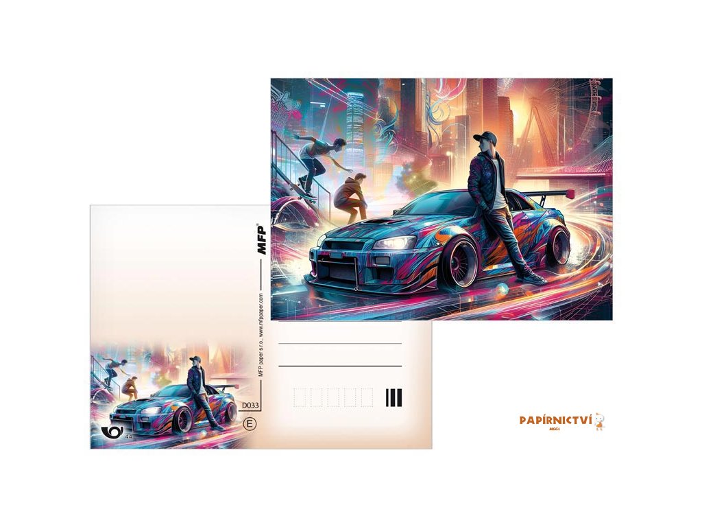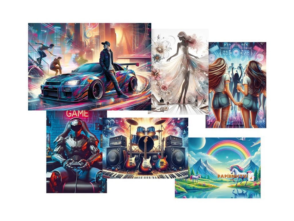 Pohlednice s motivy různých závodních prostředí (motorky, letadlo, formule…). Pohlednice jsou bez textu na zadní straně.