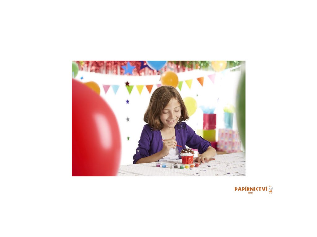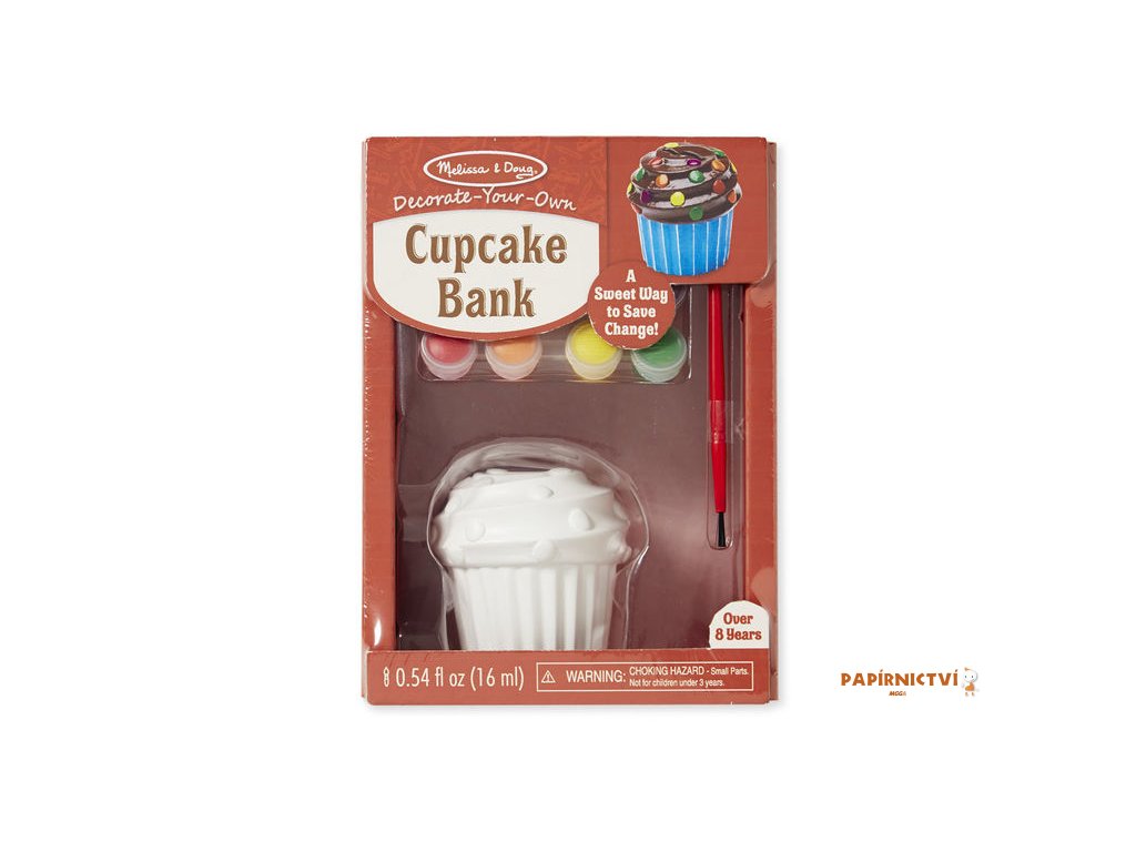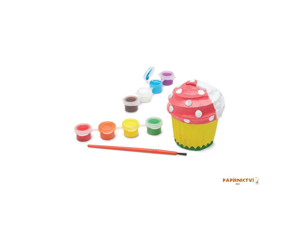 Balení obsahuje: bílou kasičku ve tvaru dortíku, 4 barvy v kelímku, štětec, návod k použití.