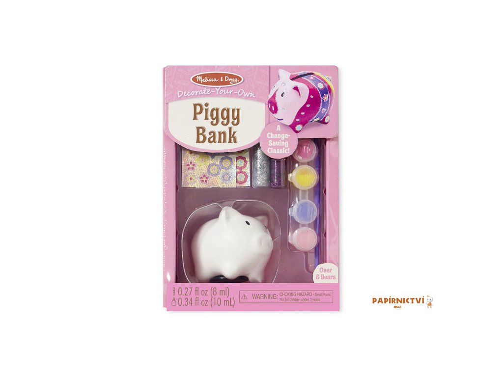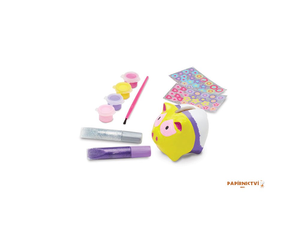 Balení obsahuje:1 x bílou kasičku ve tvaru prasátka, 4 barvy v kelímku, samolepky, štětec, návod k použití.