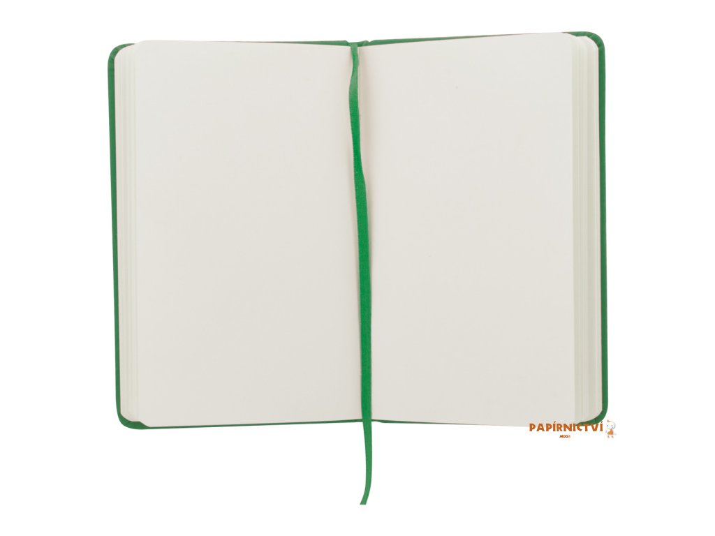 Poznámkový blok se 100 čistými listy, záložkou a gumičkou.