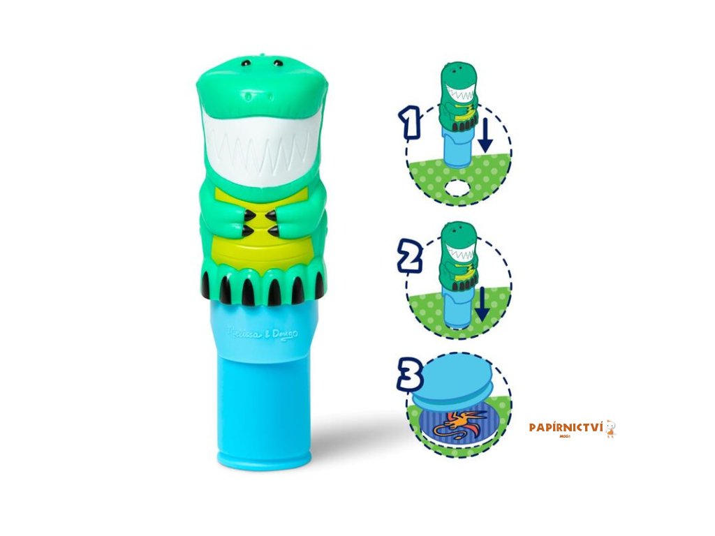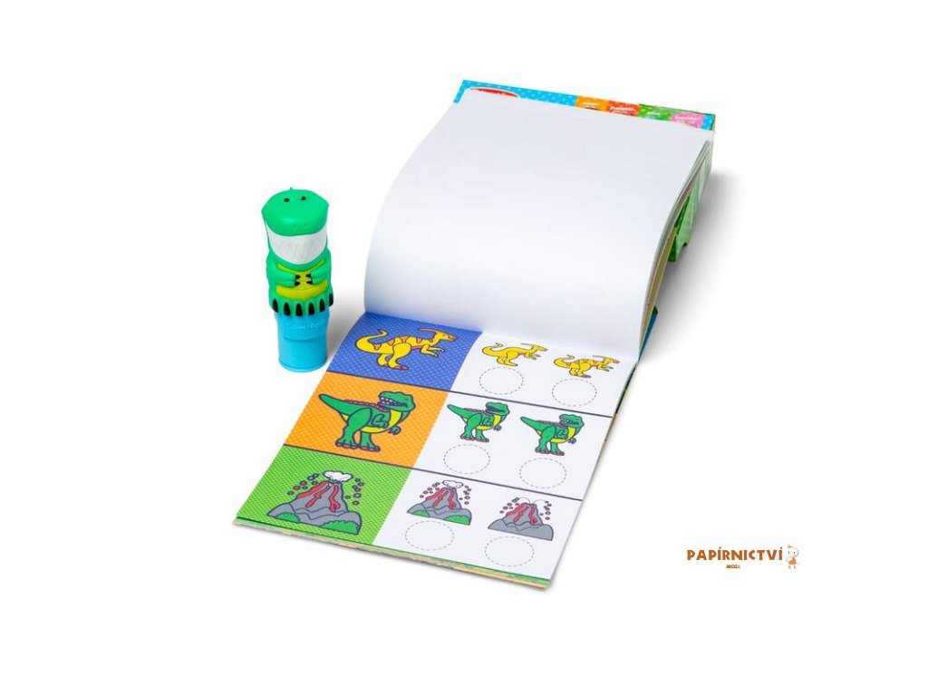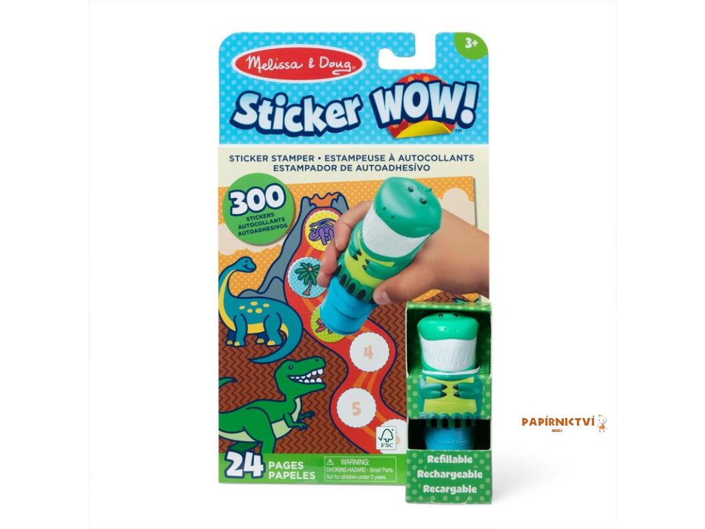 Razítkovač se samolepkami Sticker WOW!™ od Melissa & Doug je zcela nový způsob, jak si hrát se samolepkami! Nechte rozkošného sběratelského dinosaura Olivu razítkovat a razítkovat, razit si cestu přes 24 stránek plných zábavy s prehistorickou tématikou počítání, přiřazování a hledání.