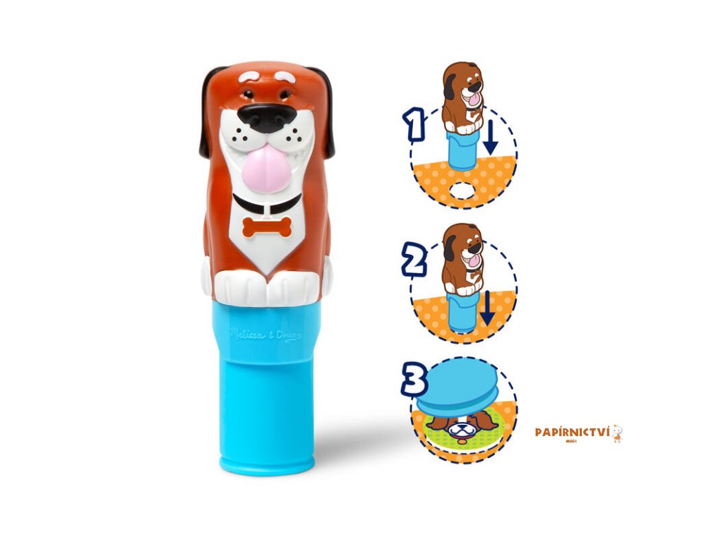 Razítkovač se samolepkami Sticker WOW!™ od Melissa & Doug je zcela nový způsob, jak si hrát se samolepkami! Nechte rozkošného sběratelského pejska razítkovat a razítkovat, razit si cestu přes 24 stránek plných zábavy s tématikou domácích mazlíčků počítání, přiřazování a hledání.