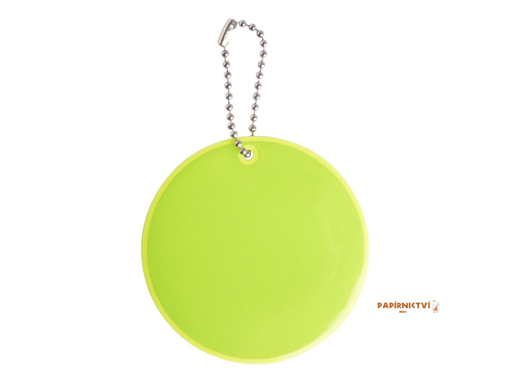 Kulatý reflexní přívěšek na klíče s kovovým řetízkem.