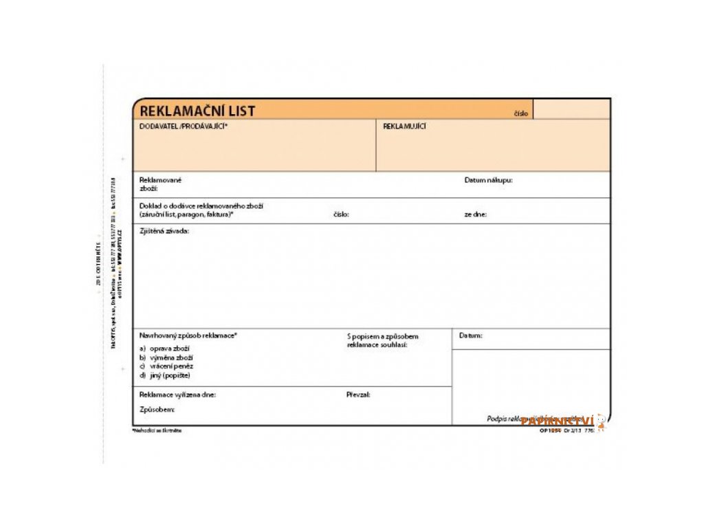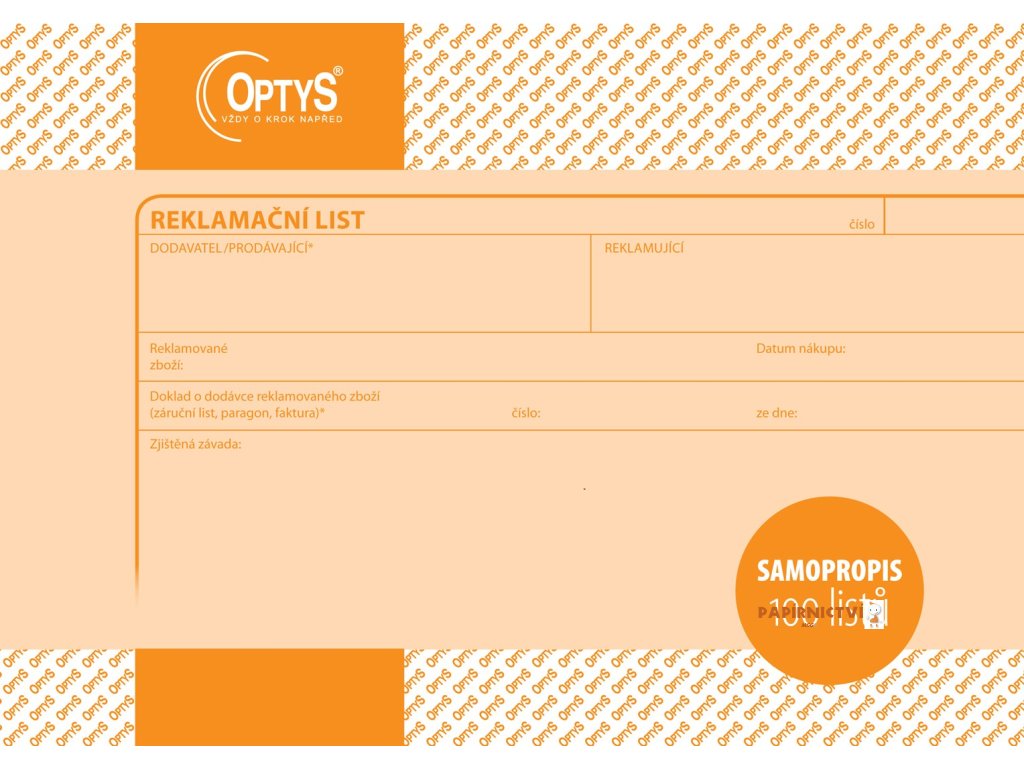 Reklamační list. Samopropisující tiskopis. Blok 100 listů. Formát A5. Oranžová obálka. Nečíslovaný.