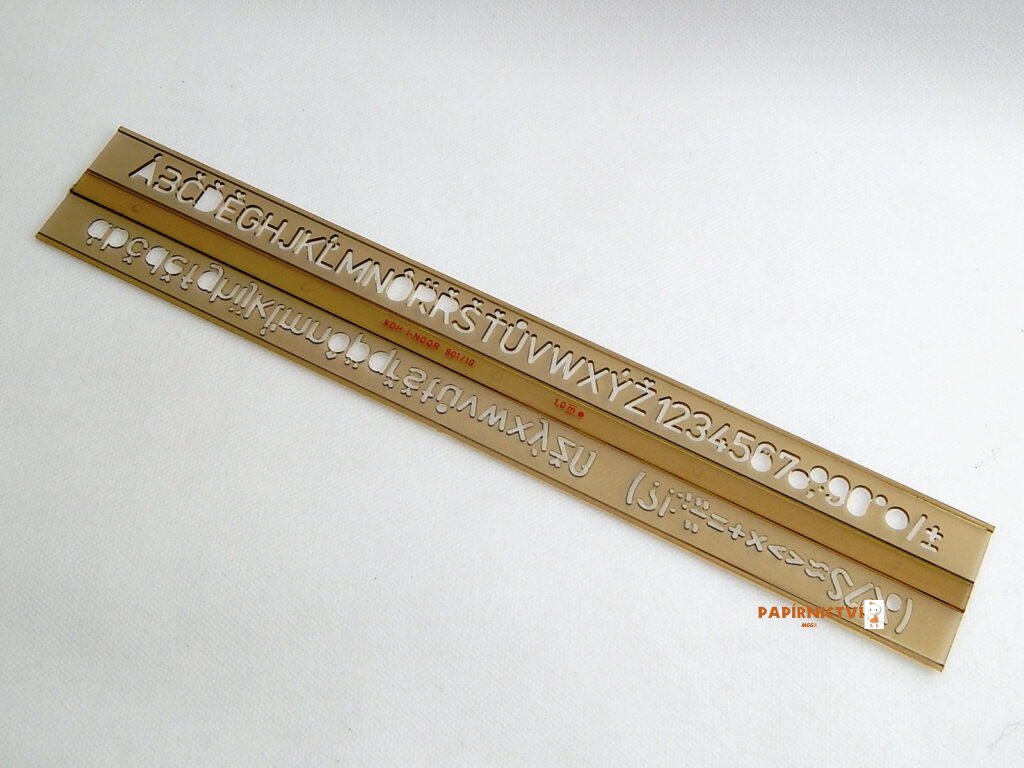 Písmenková šablona vyrobená z kouřového průhledného polystyrenu. Je určena pro práci s technickým perem 1,0 mm. Obsahuje znaky velké a malé abecedy, číslic a matematických znaků. Veškeré znaky jsou velikosti 10 mm a tvaru kolmého písma dle ČSN. Šablona je určena k popisování ve škole i v kanceláři. Zabalena je do celotransparentního polypropylenového pouzdra s papírovou vložkou a eurozávěsem.