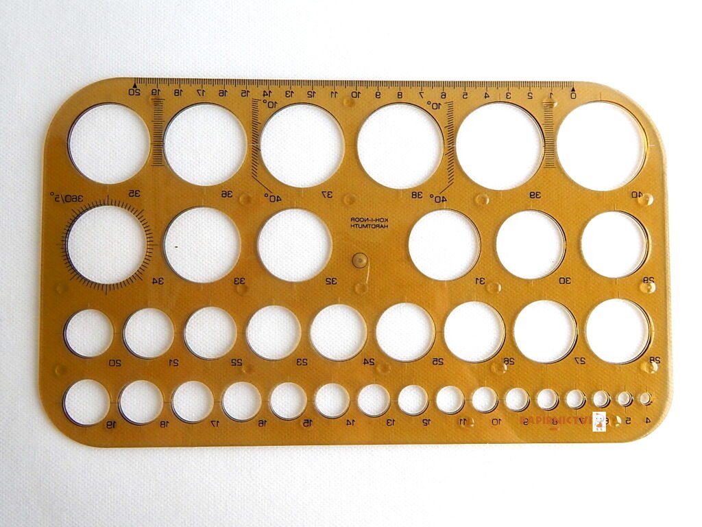 Kružnicová šablona vyrobená z kouřovéko průhledného polystyrenu. Je předurčena ke kreslení kružnic o průměrech 4 až 40 mm po 1 mm pomocí ohrocené tužky, mikrotužky, versatilky nebo technických per. Všechny kruhové otvory jsou označeny natištěnou číslicí s příslušným průměrem a osovým křížem. Dále jsou na šabloně natištěny: délková stupnice o délce 200 mm, úhloměrná stupnice 0 – 360°(á 5°), 2x úhloměrná stupnice 0 – 40°(á 1°) a stupnice pro rovnoběžky. Tisk je proveden technologií přesného sítotisku a při běžném používání je odolný proti opotřebení. Šablona je určena k rýsování a technickému kreslení ve škole i v kanceláři. Zabalena je do pelyetylenového sáčku s eurozávěsem.