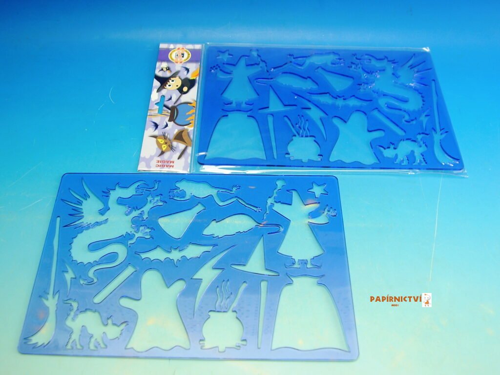 Šablona plastová na kreslení – MAGIC (motiv „magie“), rozměry 265 x 187 mm, tl. 2 mm; uložená v PP sáčku se závěsem. Barva transparentní fialová. Šablona se používá na překreslení motivu na papír.