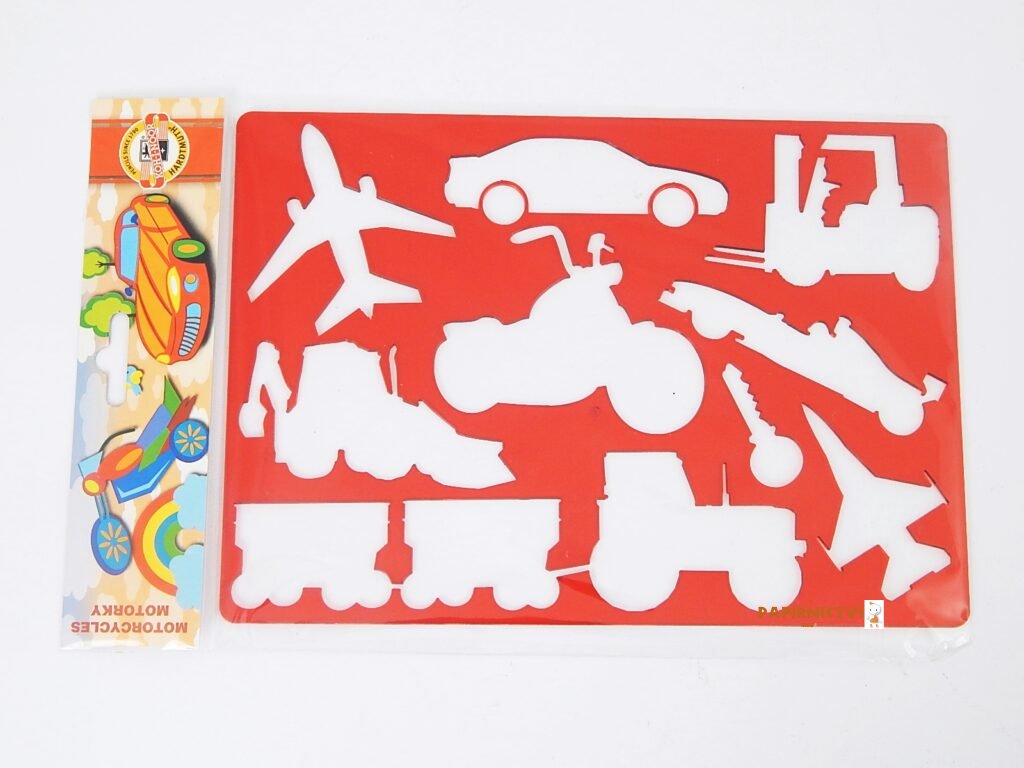 Šablona plastová na kreslení – MOTORCYCLE (motiv „motorky“), rozměry 265 x 187 mm, tl. 2 mm; uložená v PP sáčku se závěsem. Barva transparentní červená. Šablona se používá na překreslení motivu na papír.