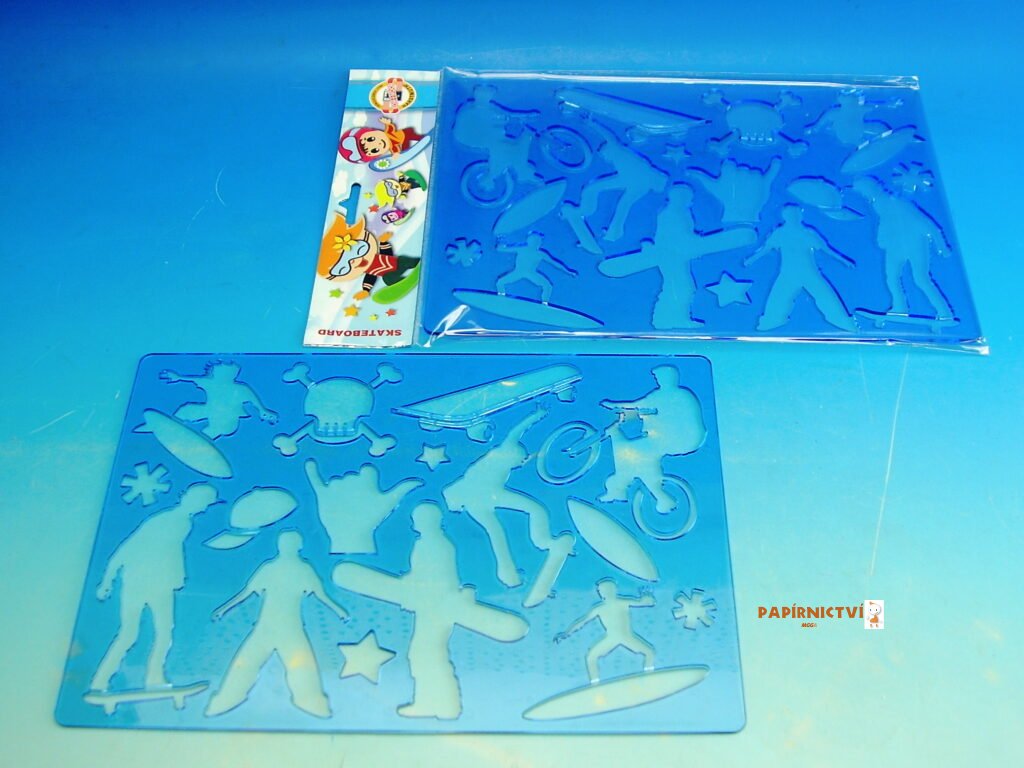 Šablona plastová na kreslení – SKATEBOARD, rozměry 265 x 187 mm, tl. 2 mm; uložená v PP sáčku se závěsem. Barva transparentní modrá. Šablona se používá na překreslení motivu na papír.