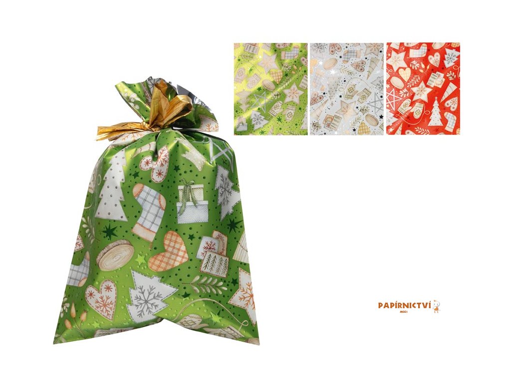 Vánoční dárkový sáček vyrobený z lesklého materiálu s dekorativním potiskem vánočních motivů. Umožňuje snadno zabalit různé druhy drobných dárků bez nutnosti použití balicího papíru. Praktický a elegantní způsob balení, který šetří čas i námahu. Sáček můžete uzavřít vázací stuhou a tím ho dozdobit.