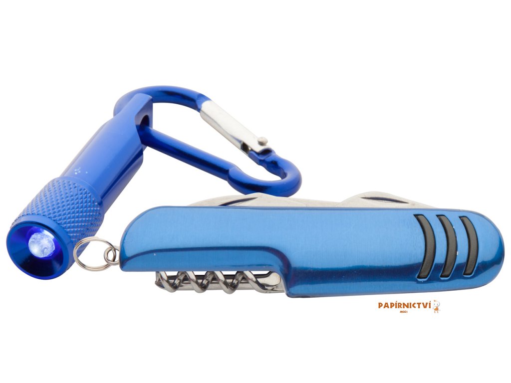 Kapesní nůž se 7-mi funkcemi s hliníkovou svítilnou na 1 LED diodu, s karabinou.