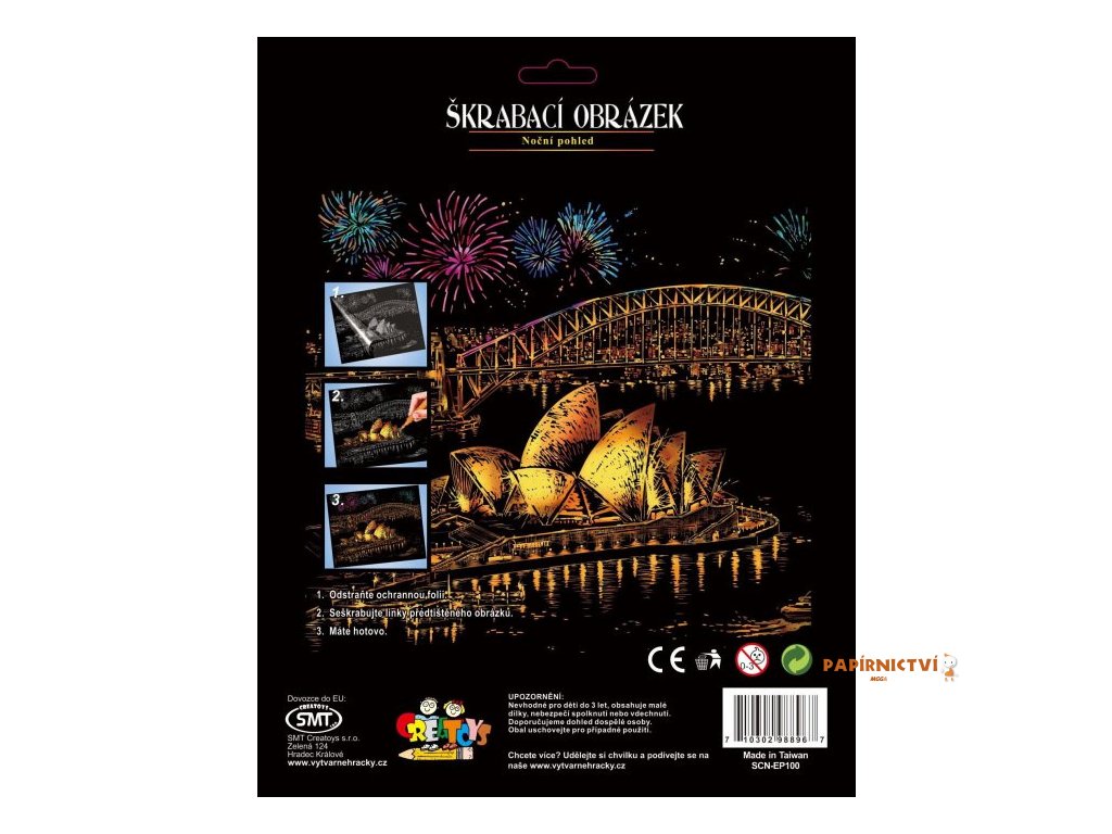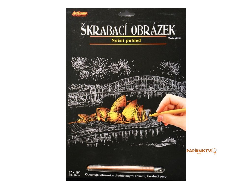 Škrabací obrázek zlatý 20 x 25 cm Sada obsahuje obrázek natištěný na černém kartonu a umělohmotné škrabací pero s kovovým hrotem. Seškrabte linky předtištěného obrázku. Vhodné pro děti od 6 let.