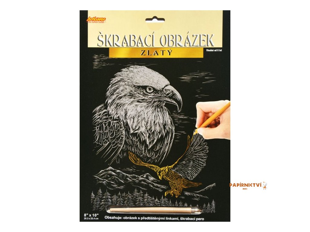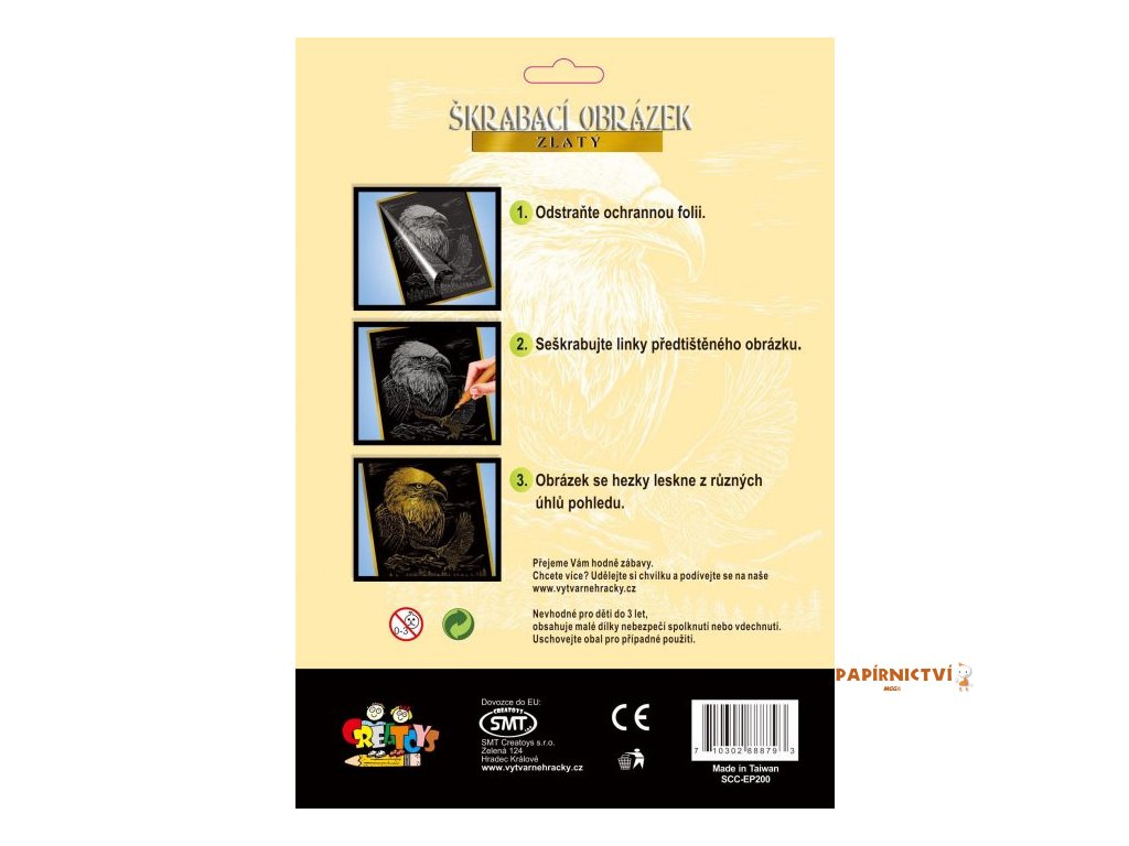Škrabací obrázek zlatý 20 x 25 cm Sada obsahuje obrázek natištěný na černém kartonu a umělohmotné škrabací pero. Seškrabte linky předtištěného obrázku. Vhodné pro děti od 6 let.