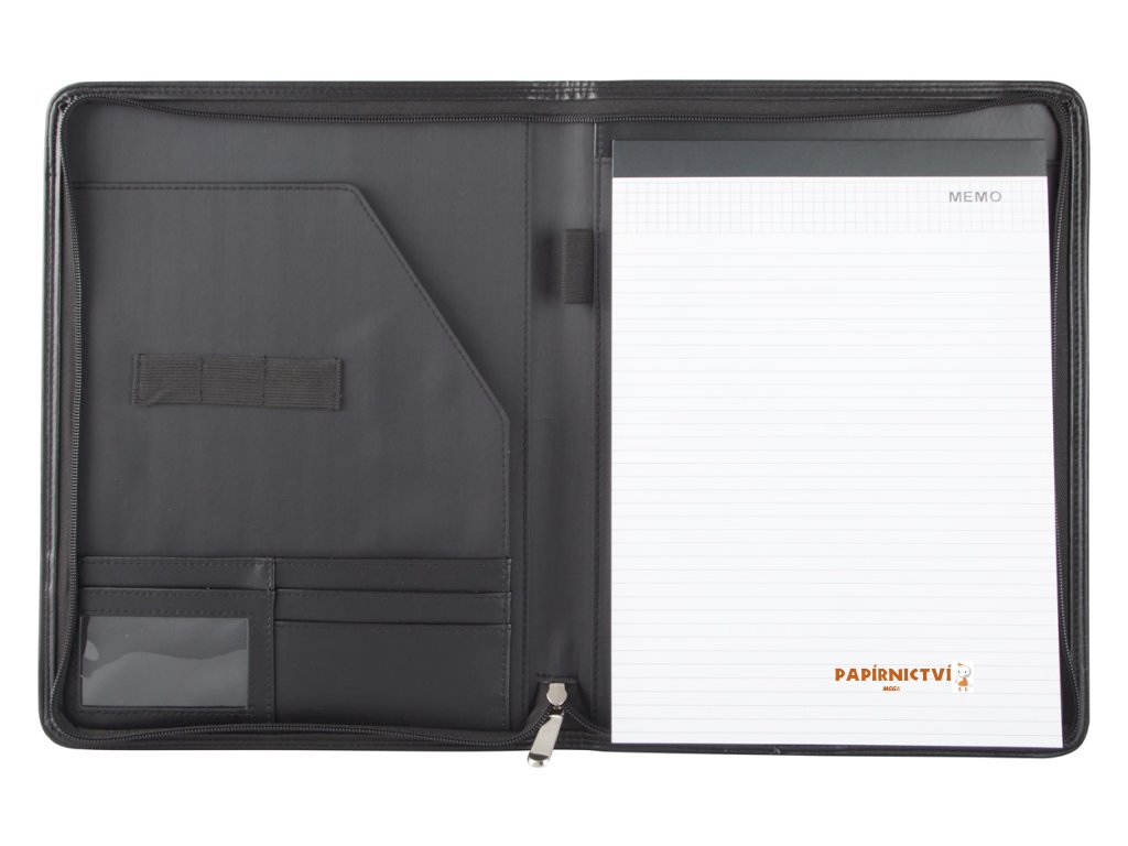 Sloha A4 na dokumenty na zip z umělé kůže s 20 listým linkovaným blokem, uchycením propisky a přihrádkou pro vizitky.