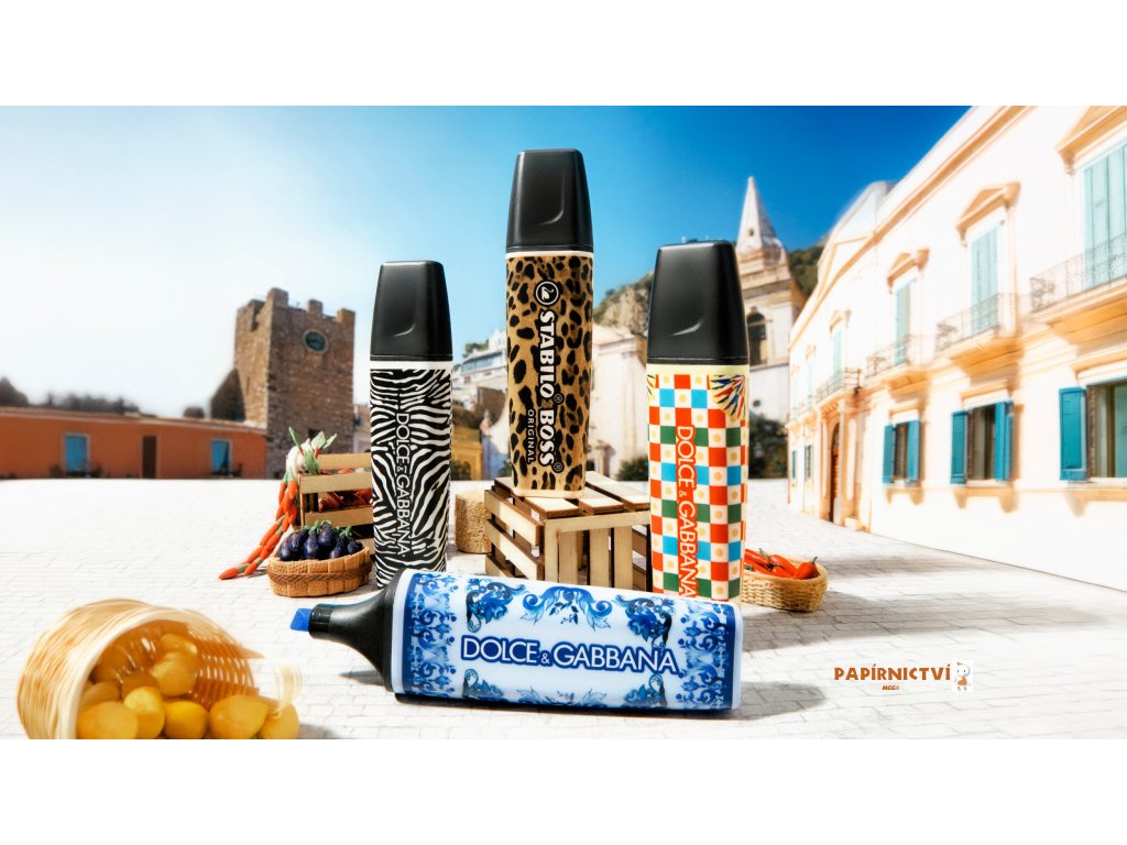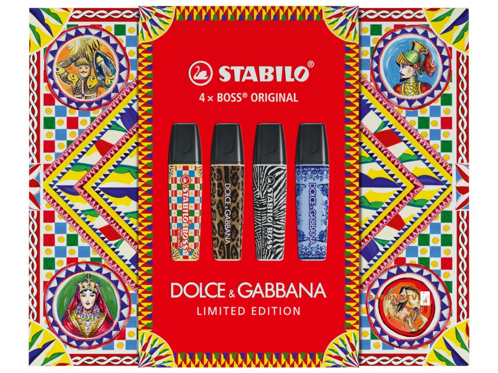 Limitovaná edice STABILO BOSS ORIGINAL x Dolce&Gabbana nabízí 3 oblíbené pastelové barvy známého zvýrazňovače a také černý marker. Každý zvýrazňovač má celoplošný potisk v jedinečném a poutavém designu Dolce&Gabbana. Ať už jako dárek, dekorace, sběratelský kousek nebo na speciální kreativní projekty: v kvalitním prémiovém boxu v designu Caretto Siciliano s magnetickým uzavíráním se exkluzivní sada stane poutačem na každém stole. Při zvýrazňování důležitých bodů nebo zapisování důležitých myšlenek zaujme zvýrazňovač STABILO BOSS ORIGINAL svojí spolehlivostí a kvalitou.