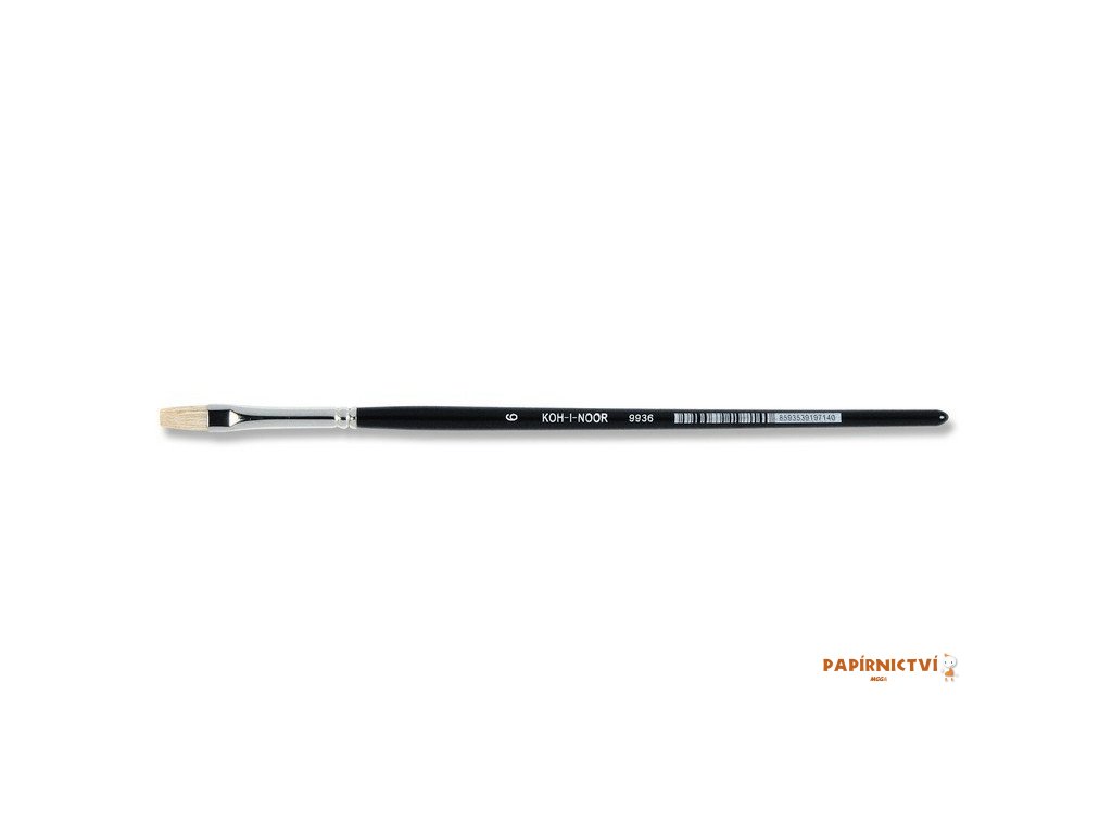 Plochý školní štětec pro školní účely. Plochý štětec č. 6, dřík černě lakovaný, toulec chromovaný. Dřík dřevěný, toulec kovový (stříbrný), vlas „prase“. Velikost: 6, šířka vlasu: 6 mm, délka vlasu: 13 mm, délka toulce: 40 mm, délka dříku: 160 mm. Celková délka štětce je 213 mm.