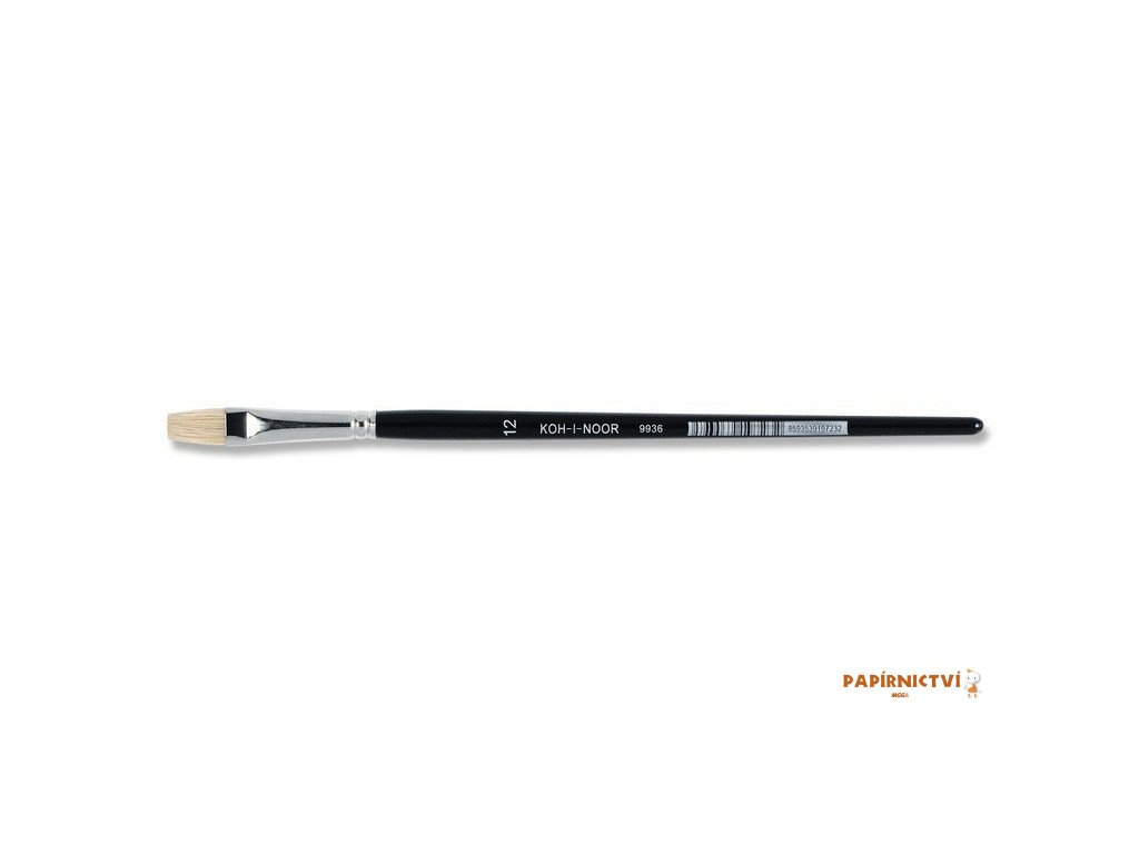 Plochý školní štětec pro školní účely. Plochý štětec č. 12, dřík černě lakovaný, toulec chromovaný. Dřík dřevěný, toulec kovový (stříbrný), vlas „prase“. Velikost: 12, šířka vlasu: 10 mm, délka vlasu: 16 mm, délka toulce: 43 mm, délka dříku: 175 mm. Celková délka štětce je 234 mm.
