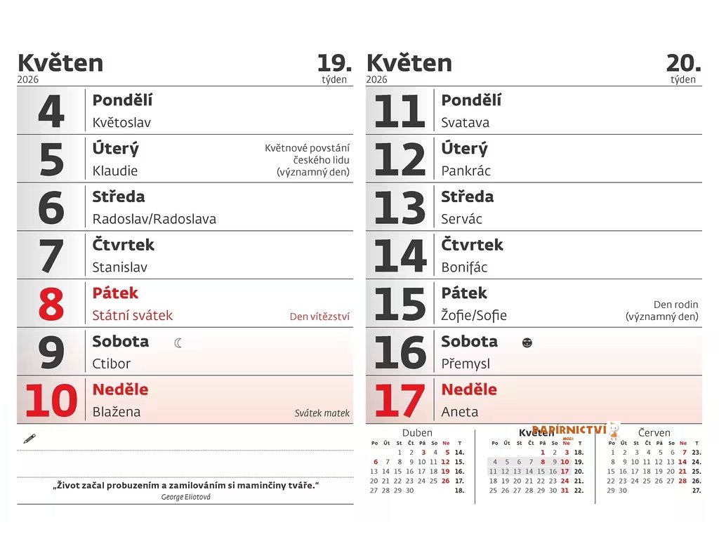 Kalendárium: české dvoutýdenní řádkové s citáty
