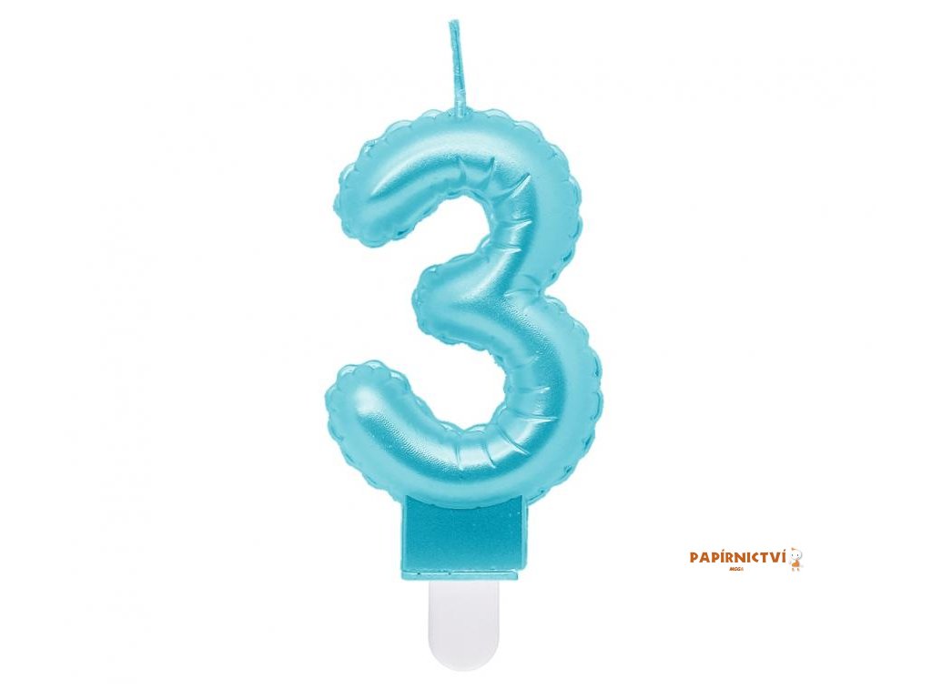 Číslice 3 svíčka na podstavci, světle modrá, perleťová
