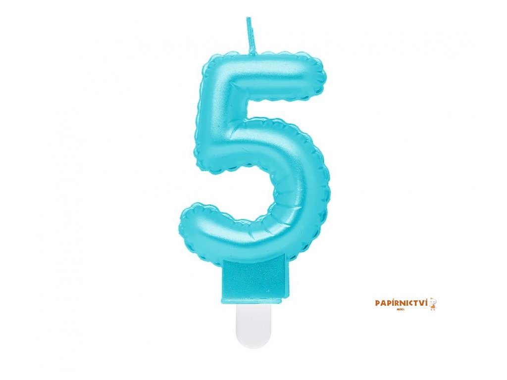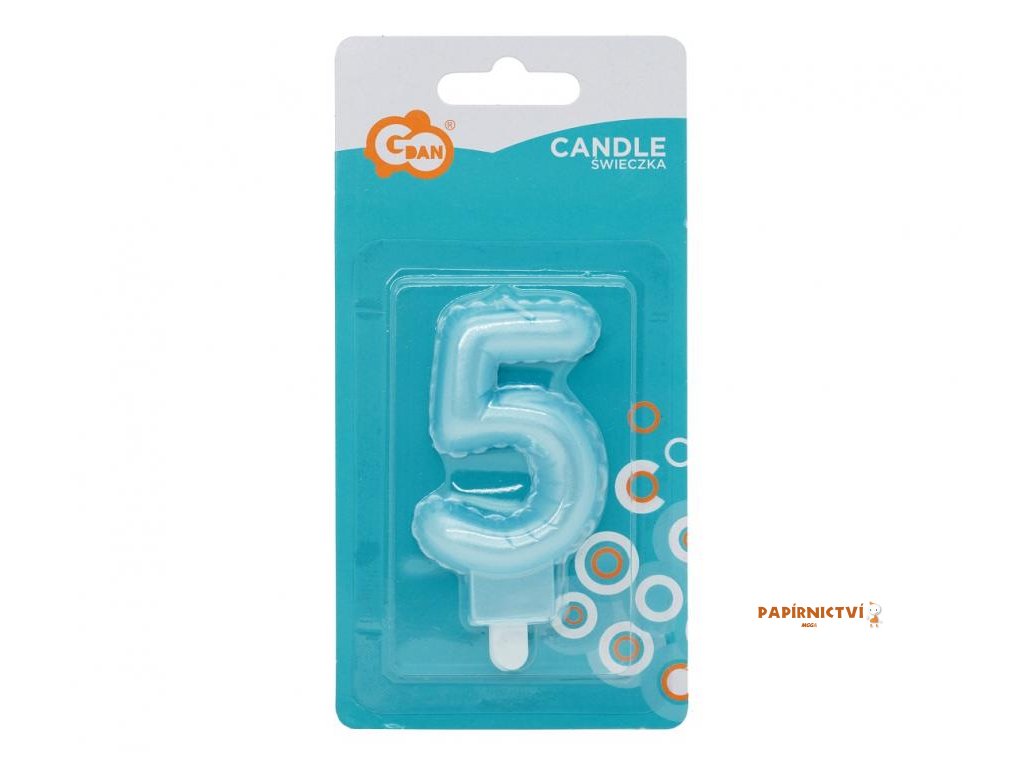 Svíčka číslo 5, perleťová světle modrá, 7 cm