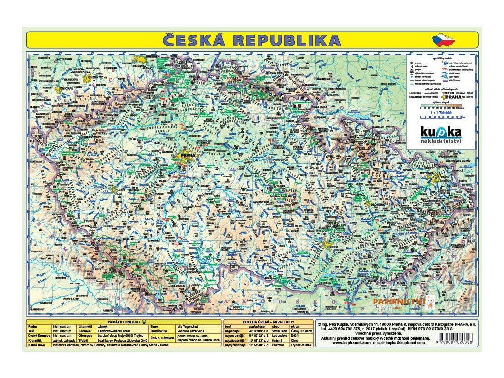 Mapa České republiky s řadou doplňkových mapek, tabulek a grafů.