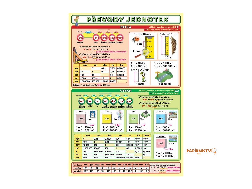 Přehledně zpracované převody jednotek délky, obsahu, objemu, hmotnosti a času.