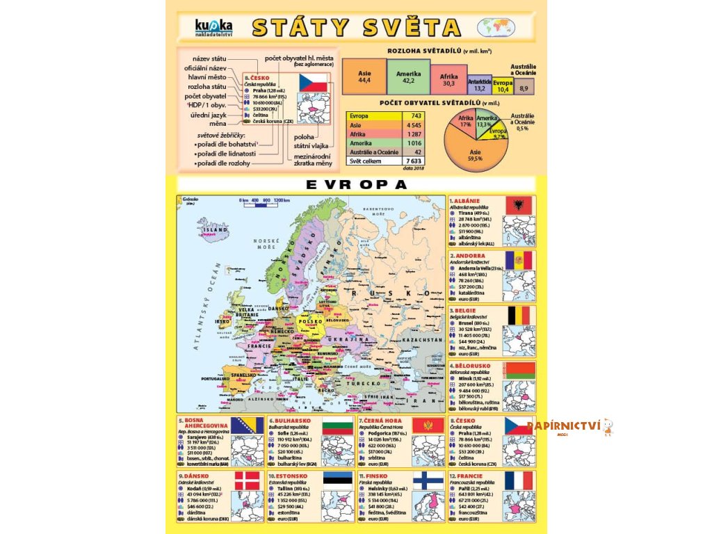 Seznam států světa v nejnovějších číslech, řazený podle světadílů. 15 údajů u každého státu (včetně mapky a státní vlajky), celkem 195 států, mapy jednotlivých světadílů, tabulky s přehledem, 7 nejlidnatějších a největších států.