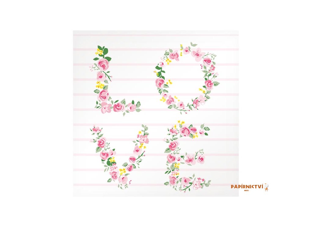 Třívrstvý papírový ubrousek. Krásné kvalitní ubrousky s nápisem „LOVE“ z růží vykouzlí příjemnou atmosféru. Ideální na zahradní prostírání, oslavy nebo na zkrášlení interiéru.