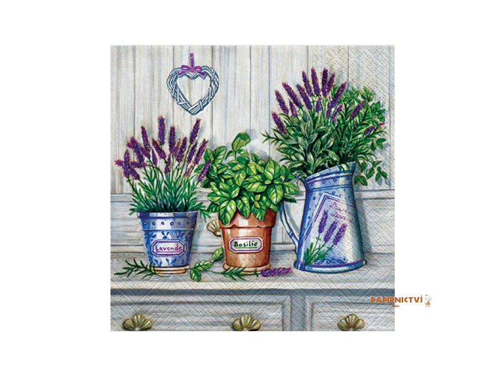 Prostírání s vůní venkova. Ubrousek s motivem levandule a bazalky v květináčích a džbánu přinese na váš stůl atmosféru provensálské kuchyně a letních dnů. Jemně laděné barvy a rustikální pozadí vytvářejí harmonii, která působí svěže a útulně.