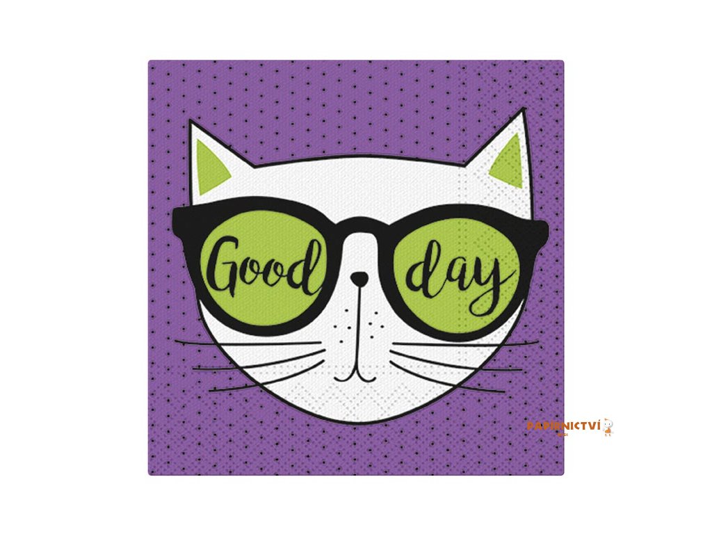 Třívrstvý papírový ubrousek. Krásné kvalitní ubrousky s motivem kočky v brýlích s nápisem „Good day“ na fialovém podkladu vykouzlí příjemnou atmosféru. Ideální na zahradní prostírání, oslavy nebo na zkrášlení interiéru.