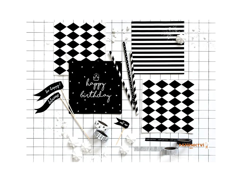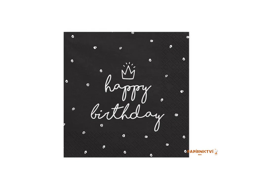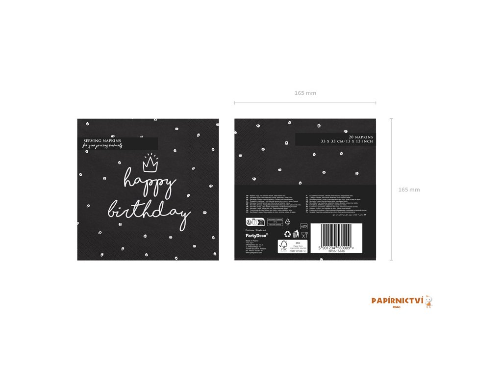 Třívrstvé ubrousky "Happy Birthday" černé s bílým potiskem, rozměry 33 x 33 cm.