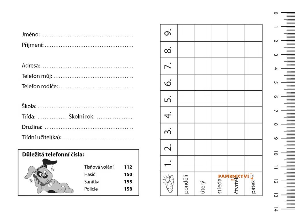 Školní deníček – úkolníček ve formátu A6 s rozvrhem hodin s možností zapisování úkolů a poznámek.