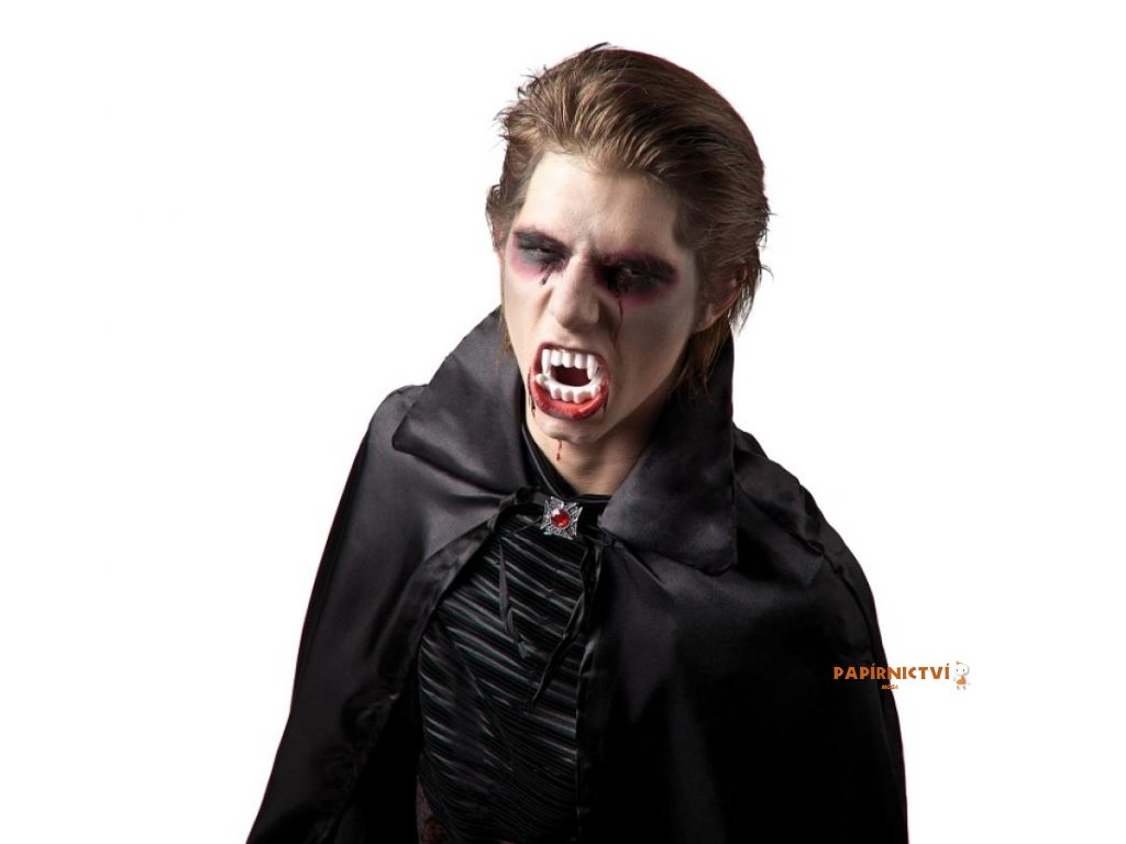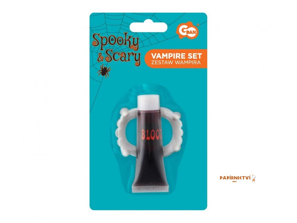 Sada obsahuje: upíří zuby a zkumavku s umělou krví