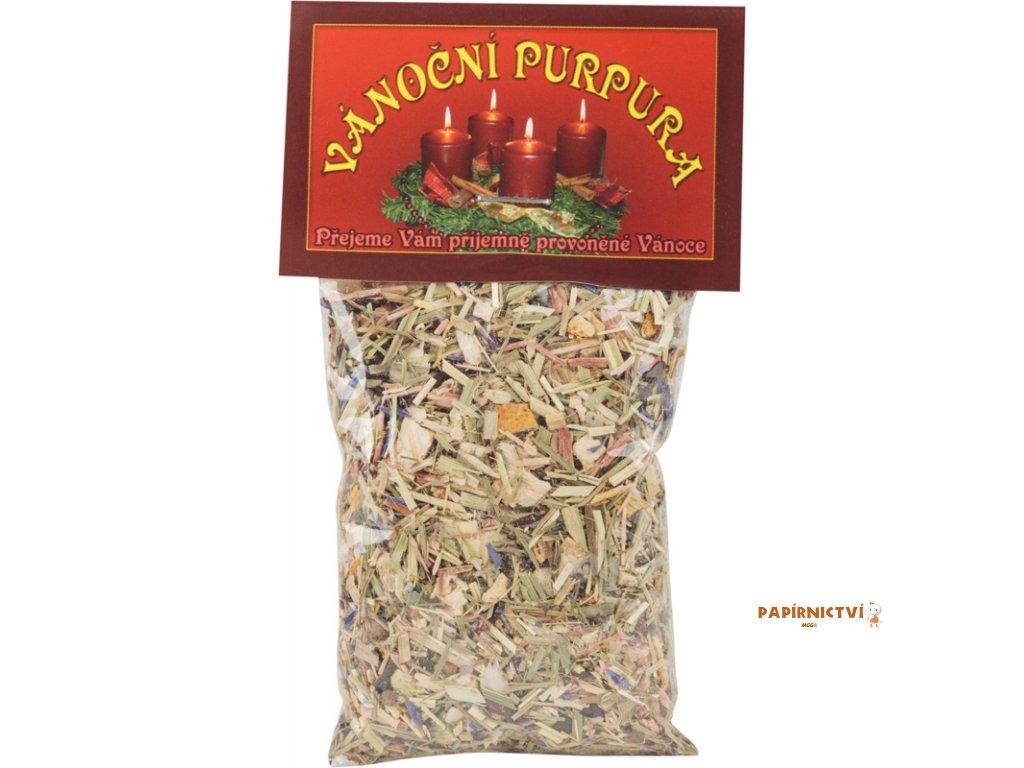 Vánoční purpura pro navození příjemné atmosféry v domácnosti, směs vonných bylin, např. levandule, skořice, hřebíček a drtě voňavých dřevin, které se teplem rozvoní.