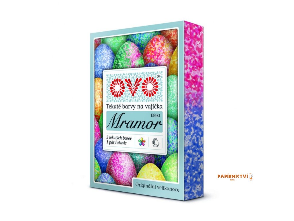 Set s efektem mramor, který je ve složení: 5 gelových barev ve složení žlutá, červená, modrá, zelená, oranžová + jeden pár rukavic ke snadnější a čistší aplikaci barevného mramorovaného efektu. Návod k použití: uvařte vajíčka natvrdo, do vody, ve které budete vařit vajíčka, přidejte ocet (1 polévková lžíce / 0,5 l vody). Vajíčka udržujte stále horká. Horké vejce rychle osušte. Navlékněte si přiložené rukavice, nakapejte do dlaně 1 - 3 kapky jedné barvy a krátce vajíčko poválejte v dlani. Pokud chcete docílit vícebarevného mramorového efektu, otřete rukavice suchým ubrouskem a postup opakujte s dalšími barvami. Pro docílení kvalitního mramorování je nutné barvit vajíčka teplá až horká. K docílení lesku vajíčka potřete tukem.