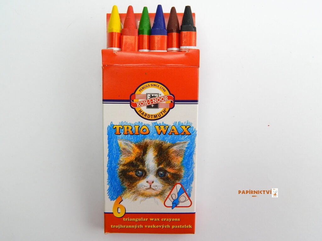 Výrobek se používá jako souprava trojhranných nerozmyvatelných voskovek určených pro školní, aranžérské a umělecké kreslení – 6 ks souprava. Souprava 6 kusů trojhranných voskovek se zašpičatělým koncem, obalených červeným ovinem. S ohledem na duševní a fyzické schopností dítěte může být výrobek vkládán do úst a ukousnut/odlomen. Dítě ukousnutou/odlomenou část spolkne. Spolknutá část projde trávicím traktem bez zjevného ovlivnění traktu. Rozměr 1 voskovky - TR 8,2 mm, délka 90 mm.