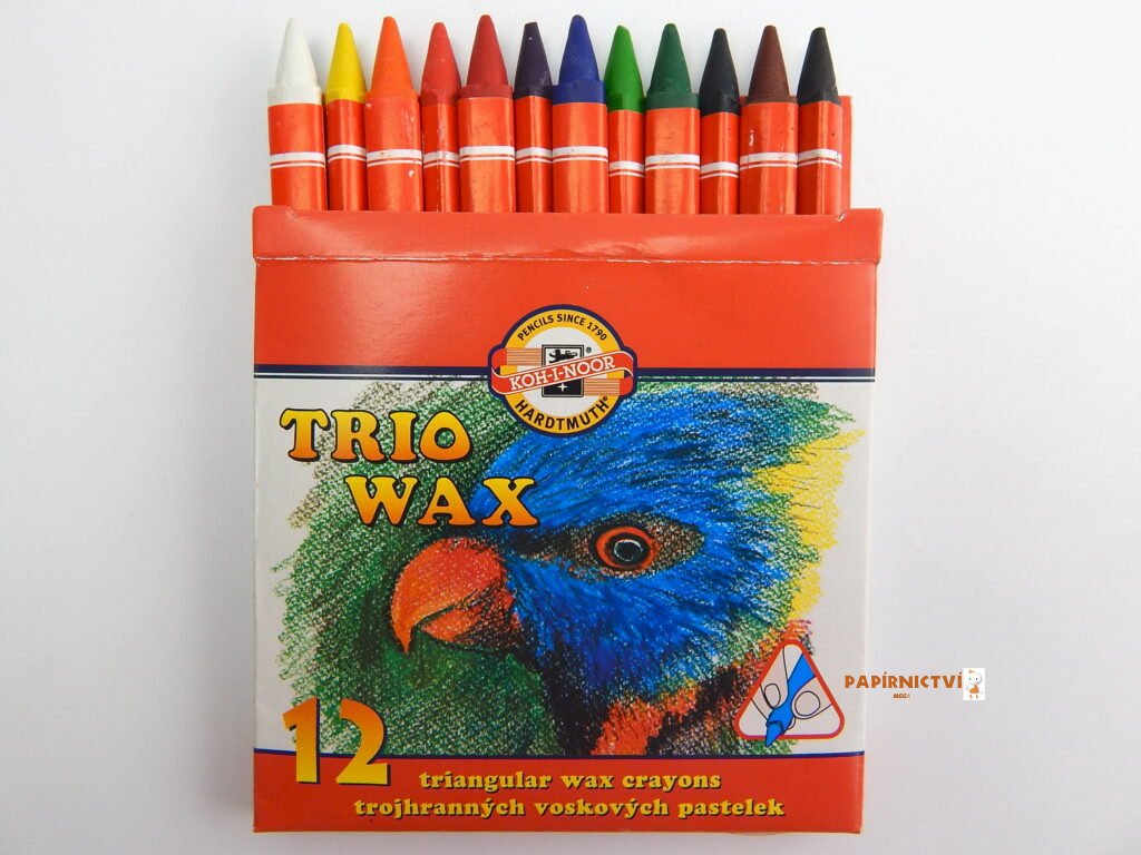 Souprava 12 kusů trojhranných voskovek se zašpičatělým koncem o rozměrech TR 8,2 mm, délka 90 mm. Každá voskovka je obalená červeným zavinovacím štítkem. Výrobek se používá jako souprava trojhranných voskovek určených pro školní, aranžérské a umělecké kreslení – 12 ks souprava. S ohledem na duševní a fyzické schopností dítěte může být výrobek vkládán do úst a ukousnut/odlomen. Dítě ukousnutou/odlomenou část spolkne. Spolknutá část projde trávicím traktem bez zjevného ovlivnění traktu.