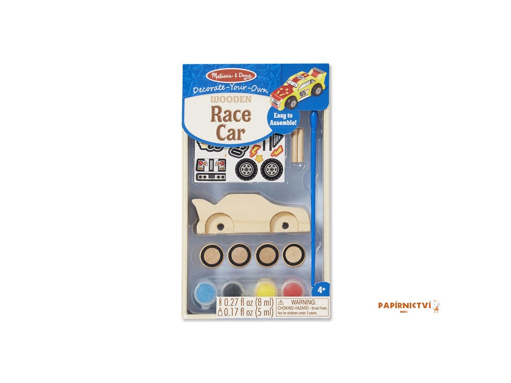 Obsahuje: dřevěné komponenty závodního auta, 4 barvy v kelímku, štětec, lepidlo, samolepky a jednoduchý návod k sestavení.