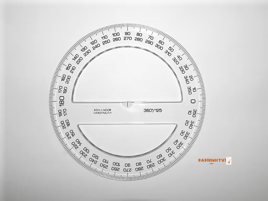 Úhloměr 360/125 vyrobený z čirého průhledného polystyrenu. Dvě úhloměrné stupnice na oblouku jsou tištěny technologií přesného sítotisku. Tisk stupnic je odolný proti opotřebení při běžném používání. Úhloměr je určený k rýsování a technickému kreslení ve škole i v kanceláři. Zabalen je do polyetylenového sáčku s eurozávěsem.