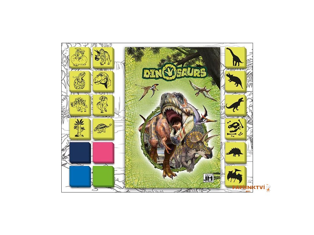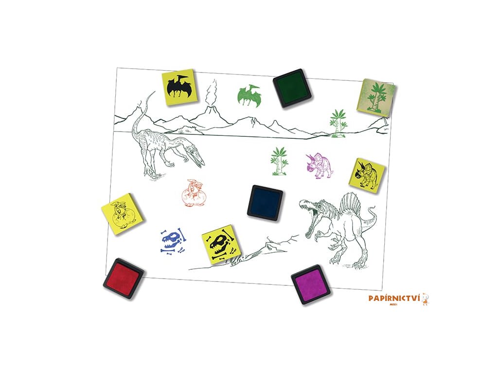 Set obsahuje 14 pěnových razítek, 4 barevné podušky a blok plný zábavných aktivit k luštění a vyplnění.