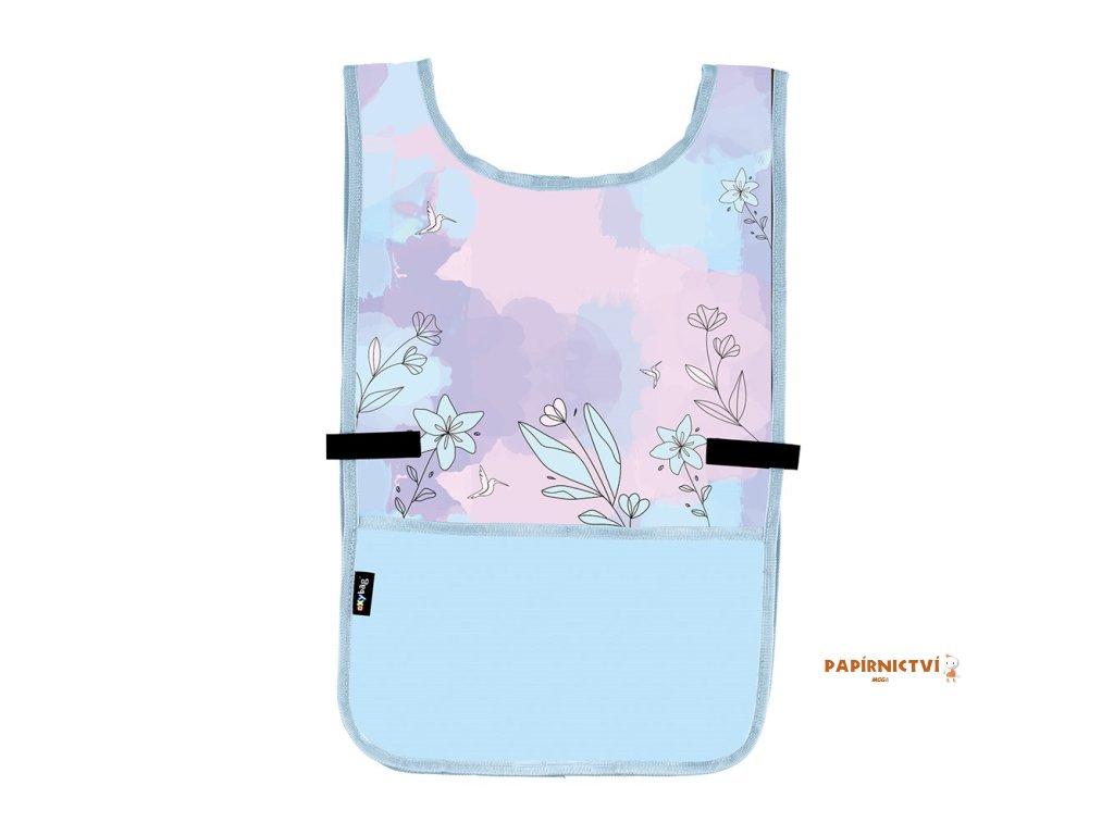 Zástěra pončo do výtvarné výchovy či na jiné tvořící aktivity. Oblékání přes hlavu, po stranách zapínání na druk. Vpředu jedna prostorná kapsa. Materiál 100% polyester.